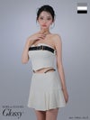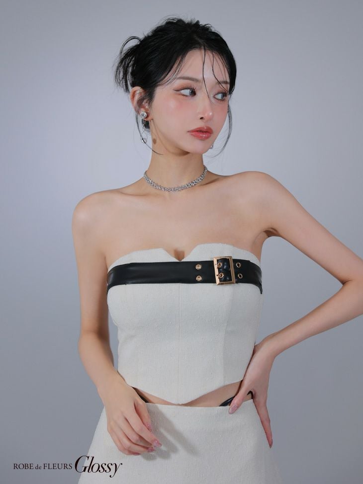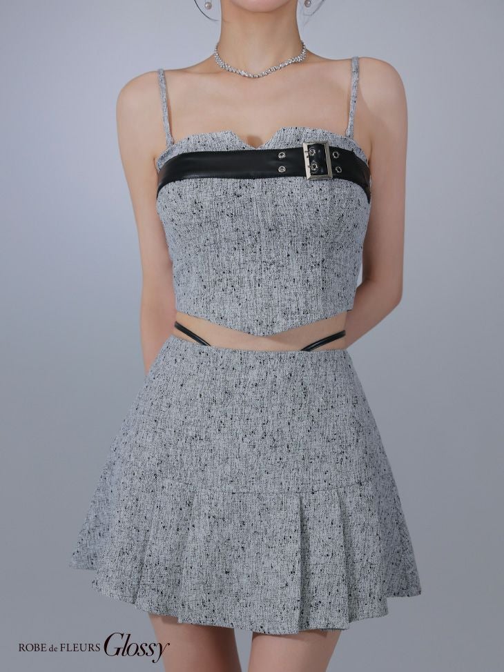 大胆な肌魅せで視線独占♡ [ROBEdeFLEURSGlossy/ローブドフルールグロッシー] 高級 2way ベア キャミソール ベルトデザイン ツイード ウエストレザーコード セットアップ フレアミニドレス