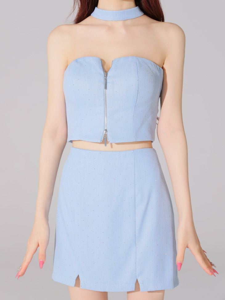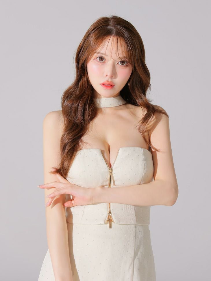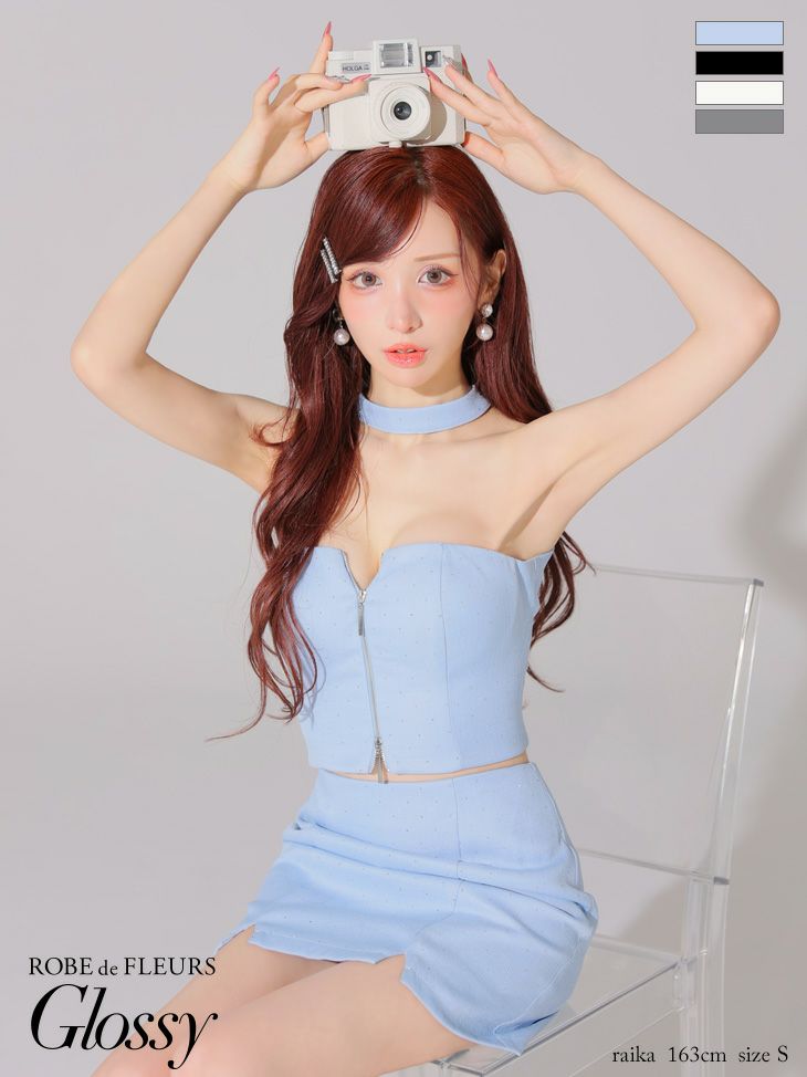 ジップで引き締まった印象に♡ [ROBEdeFLEURSGlossy/ローブドフルールグロッシー] 高級 ブランド タイトミニドレス セットアップ ホルターネック ツイード ジップ ストーン