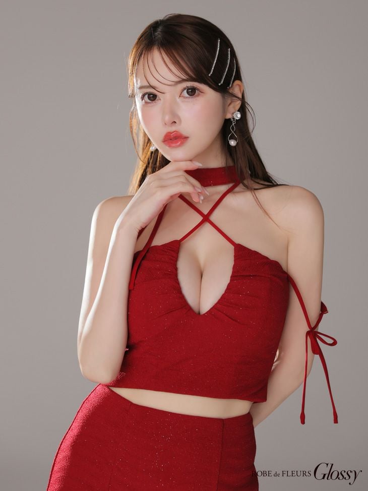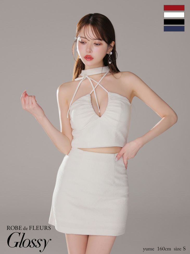 5. [ROBEdeFLEURSGlossy/ローブドフルールグロッシー] 高級 ホルターネック セットアップ リボン ラメ入り ワンカラー バストカット 谷間魅せ タイトミニドレス