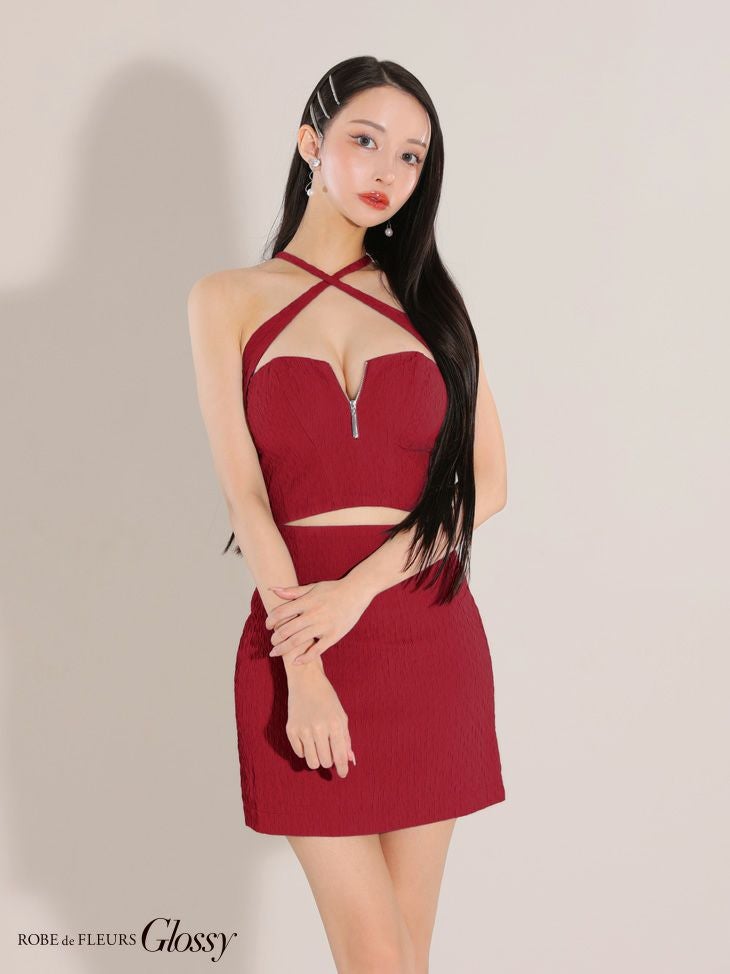 ワンカラーで大人っぽく☆ [ROBEdeFLEURSGlossy/ローブドフルールグロッシー] 高級 クロスホルターネック ワンカラー フロントジップ セットアップ バストカット 谷間魅せ タイトミニドレス