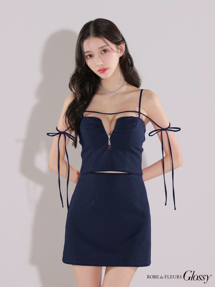 5. [ROBEdeFLEURSGlossy/ローブドフルールグロッシー] 高級 キャミソール ジップ セットアップ リボン リブニット バストカット 谷間魅せ タイトミニドレス