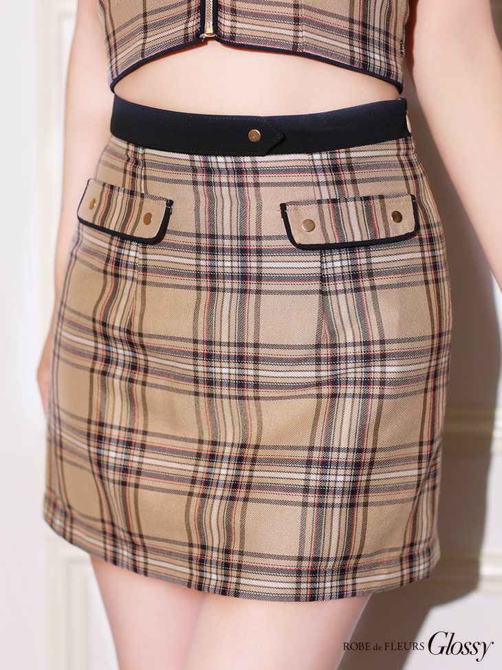トレンド感溢れるデザインで差をつける★ [ROBEdeFLEURSGlossy/ローブドフルールグロッシー] 高級チェック柄レザーパイピングジップキャミソールセットアップタイトミニドレス