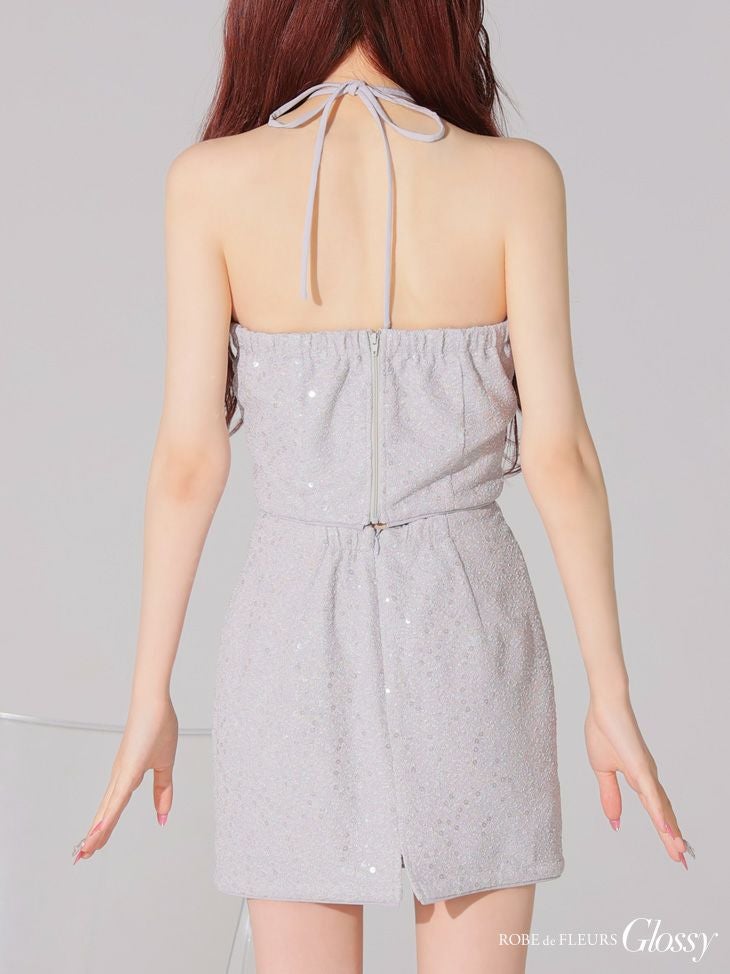 5. [ROBEdeFLEURSGlossy/ローブドフルールグロッシー] 高級 クロスホルターネック スパンコール 背中魅せ セットアップ タイトミニドレス