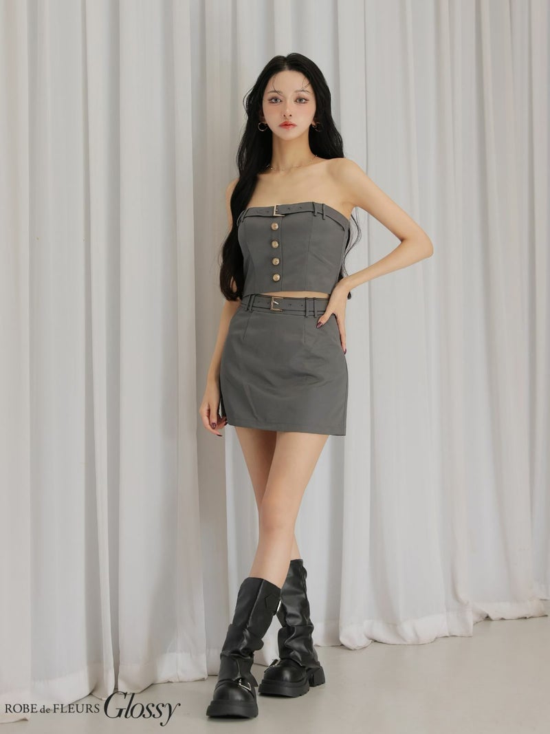 胸元のベルトデザインが目を惹く♡ [ROBEdeFLEURSGlossy/ローブドフルールグロッシー] 高級 ブランド Aラインミニドレス 谷間 キャミソール ベア 2way セットアップ ウエストベルト フロントボタン ワンカラー