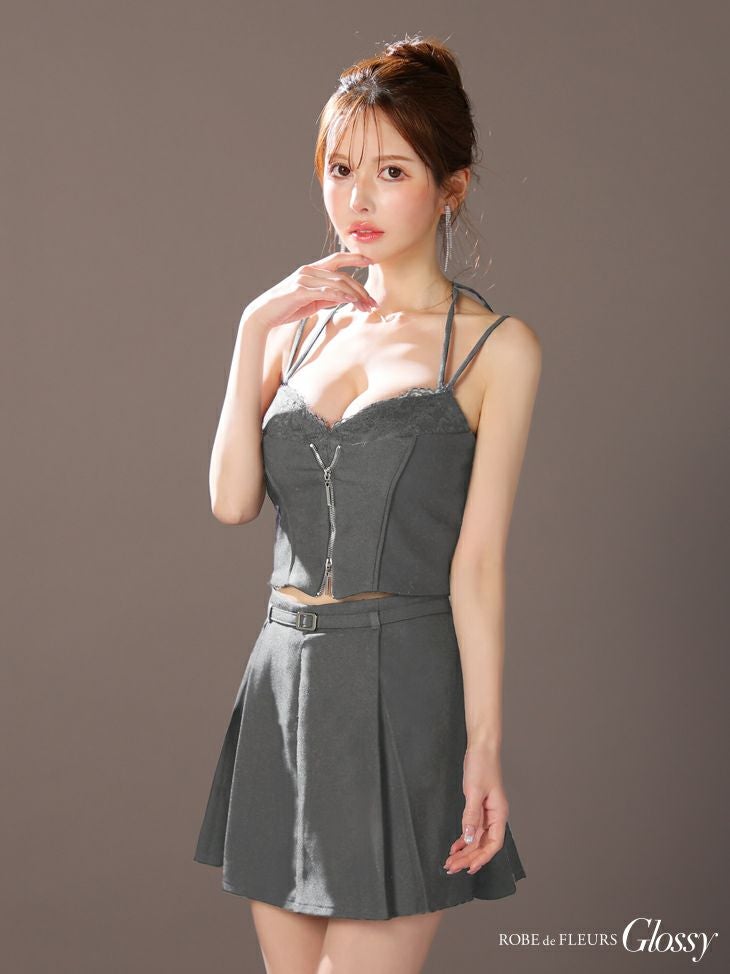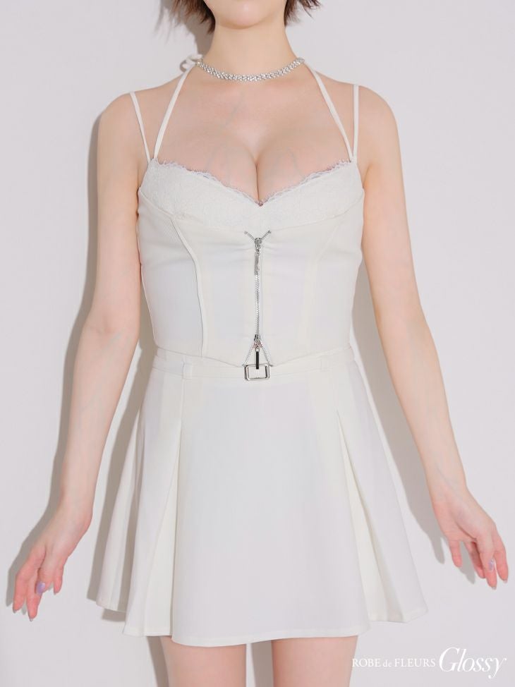 レース×ジップで色気溢れる☆ [ROBEdeFLEURSGlossy/ローブドフルールグロッシー] 高級 キャミソール ネックリボン セットアップ ウエストベルト レース ジップ フレアミニドレス
