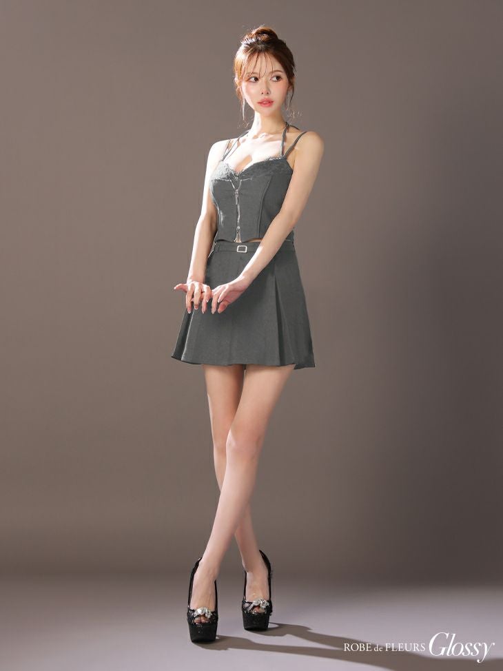 絶妙な甘辛バランスで差をつける♡ [ROBEdeFLEURSGlossy/ローブドフルールグロッシー] 高級 キャミソール ネックリボン セットアップ ウエストベルト レース ジップ フレアミニドレス