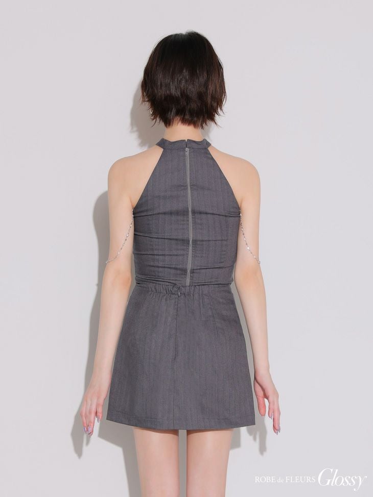 4. [ROBEdeFLEURSGlossy/ローブドフルールグロッシー] 高級 ベアトップ セットアップ ジップ ウエストベルト チョーカーデザイン チェーン タイトミニドレス