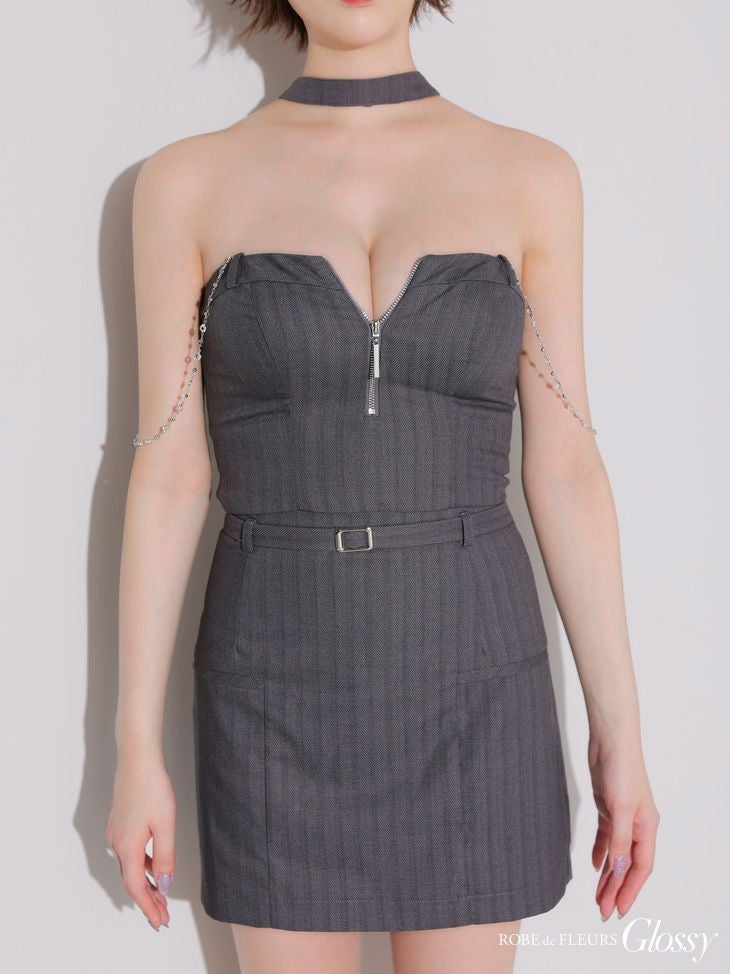 5. [ROBEdeFLEURSGlossy/ローブドフルールグロッシー] 高級 ベアトップ セットアップ ジップ ウエストベルト チョーカーデザイン チェーン タイトミニドレス
