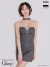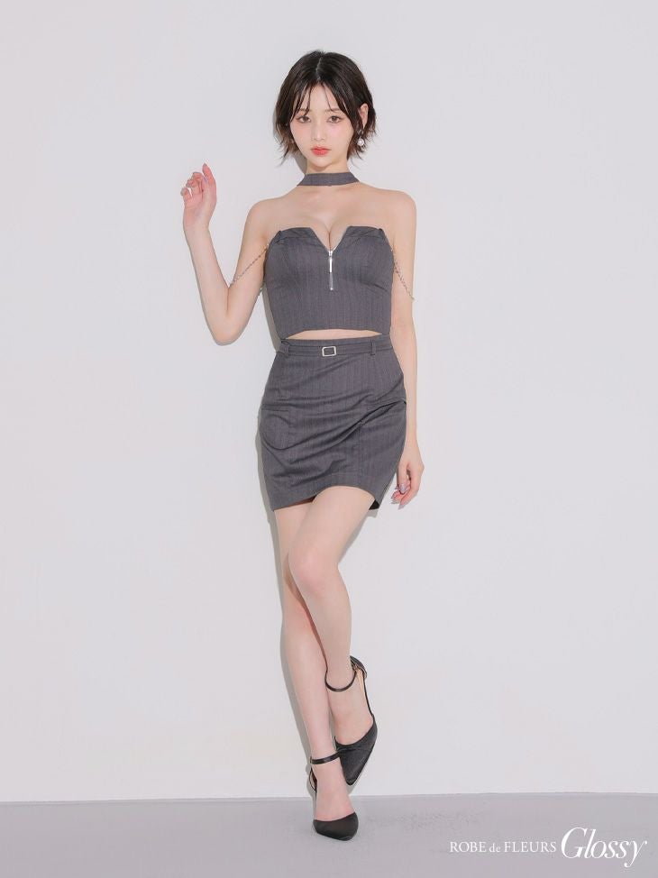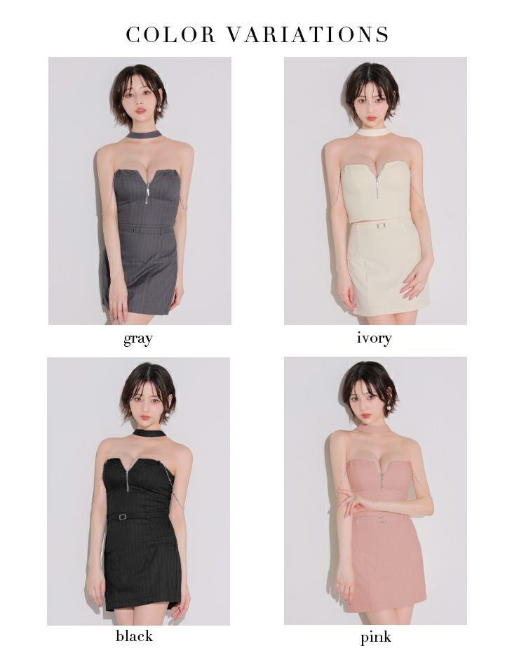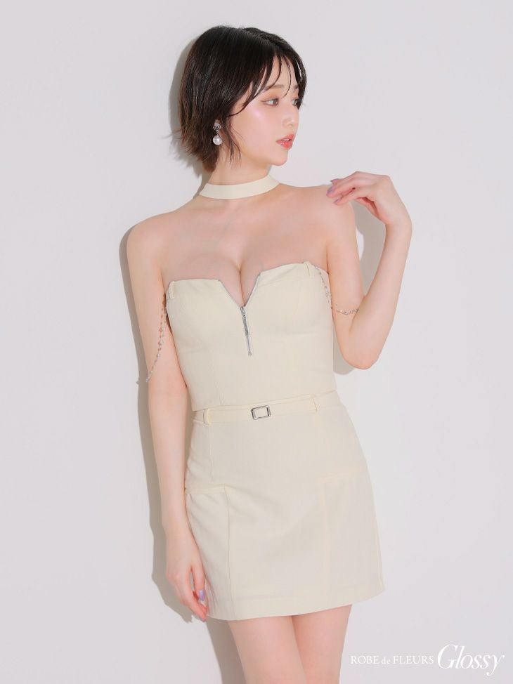 谷間の強調でsexyに魅せる☆ [ROBEdeFLEURSGlossy/ローブドフルールグロッシー] 高級 ベアトップ セットアップ ジップ ウエストベルト チョーカーデザイン チェーン タイトミニドレス