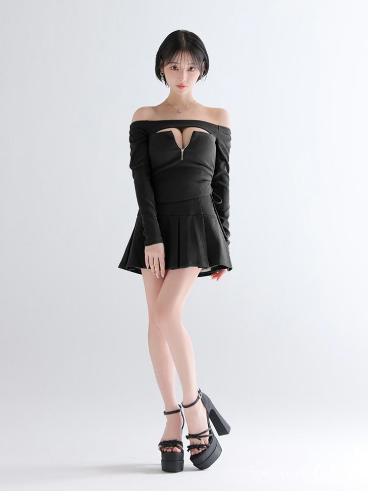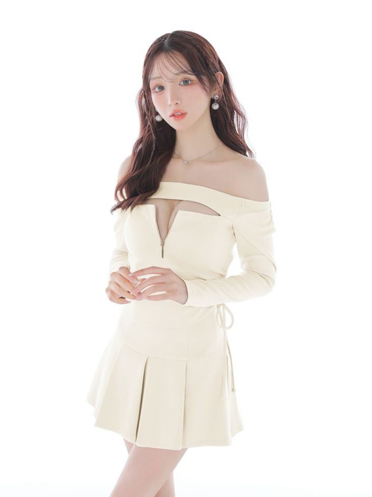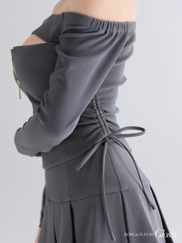大胆な谷間魅せで視線をキャッチ♡ [ROBEdeFLEURSGlossy/ローブドフルールグロッシー] 高級 ブランド Aラインミニドレス 長袖 袖あり 谷間 オフショルダー セットアップ ジップ ドロストデザイン プリーツ