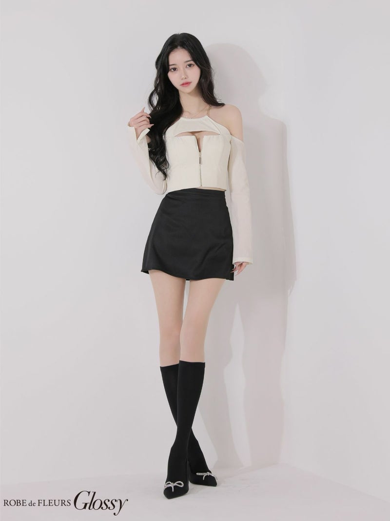 5. [ROBEdeFLEURSGlossy/ローブドフルールグロッシー] 高級 ブランド タイトミニドレス 谷間 セットアップ 長袖 肩あき ジップ バイカラー