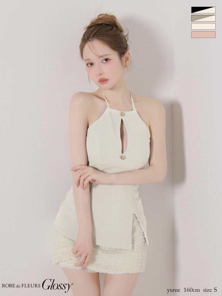 4. [ROBEdeFLEURSGlossy/ローブドフルールグロッシー] 高級 ブランド タイトミニドレス 谷間 セットアップ ホルターネック 背中魅せ バックリボン バストカット リブ レース