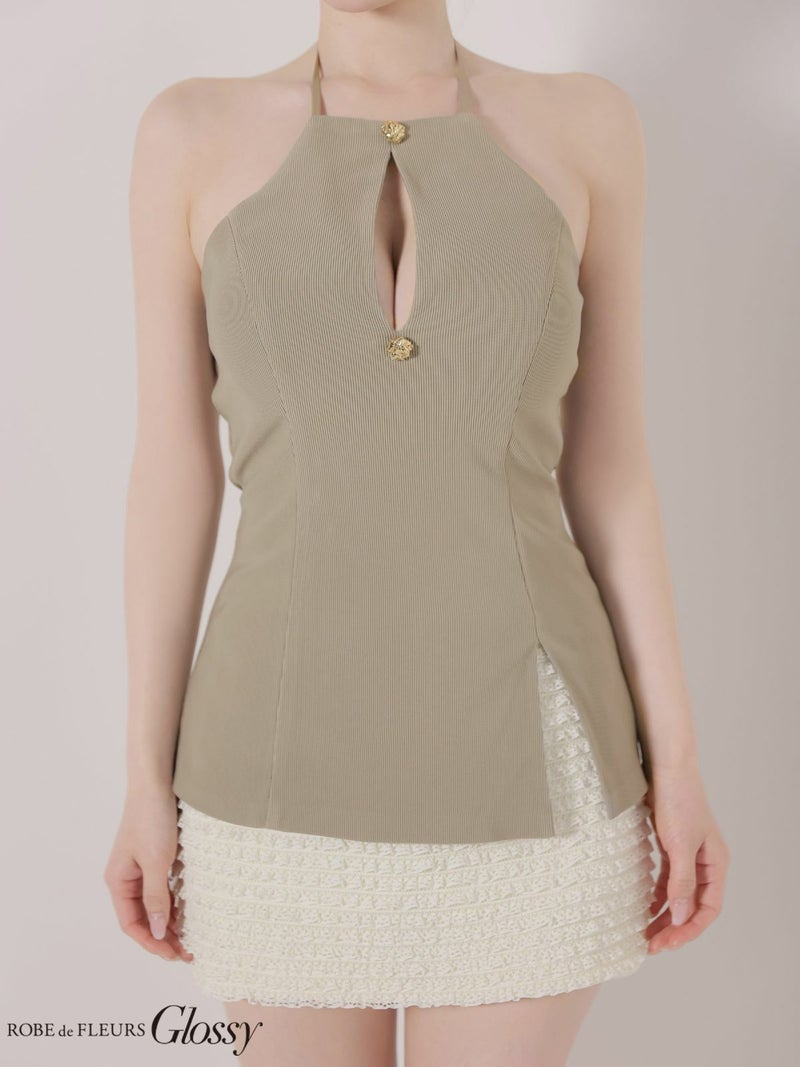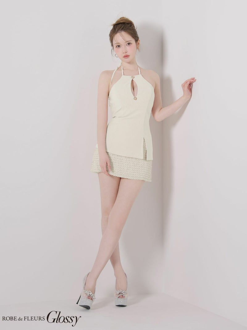 後ろ姿も抜かりなくセクシーに♡ [ROBEdeFLEURSGlossy/ローブドフルールグロッシー] 高級 ブランド タイトミニドレス 谷間 セットアップ ホルターネック 背中魅せ バックリボン バストカット リブ レース
