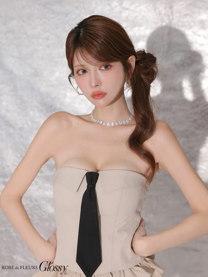 甘辛スタイルで差をつける♡ [ROBEdeFLEURSGlossy/ローブドフルールグロッシー] 高級 ブランド Aラインミニドレス セットアップ 谷間 ベア ネクタイ付き ティアードフリル