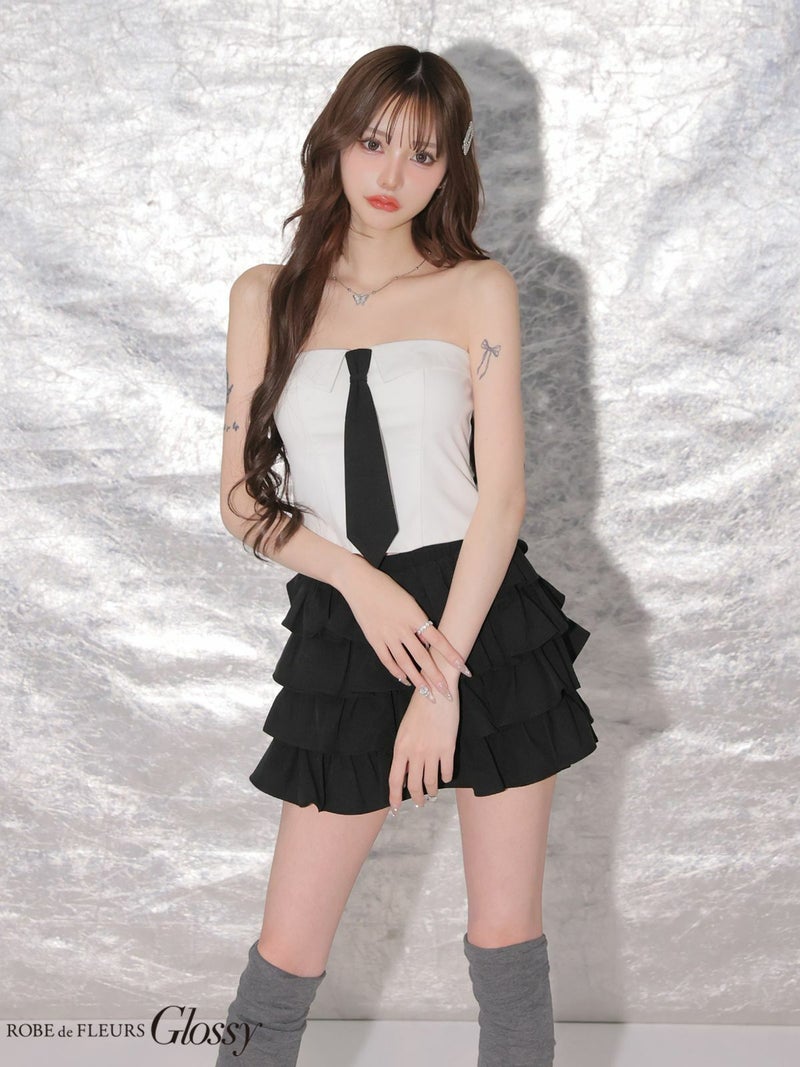 ネクタイが目を惹くセットアップ♡ [ROBEdeFLEURSGlossy/ローブドフルールグロッシー] 高級 ブランド Aラインミニドレス セットアップ 谷間 ベア ネクタイ付き ティアードフリル