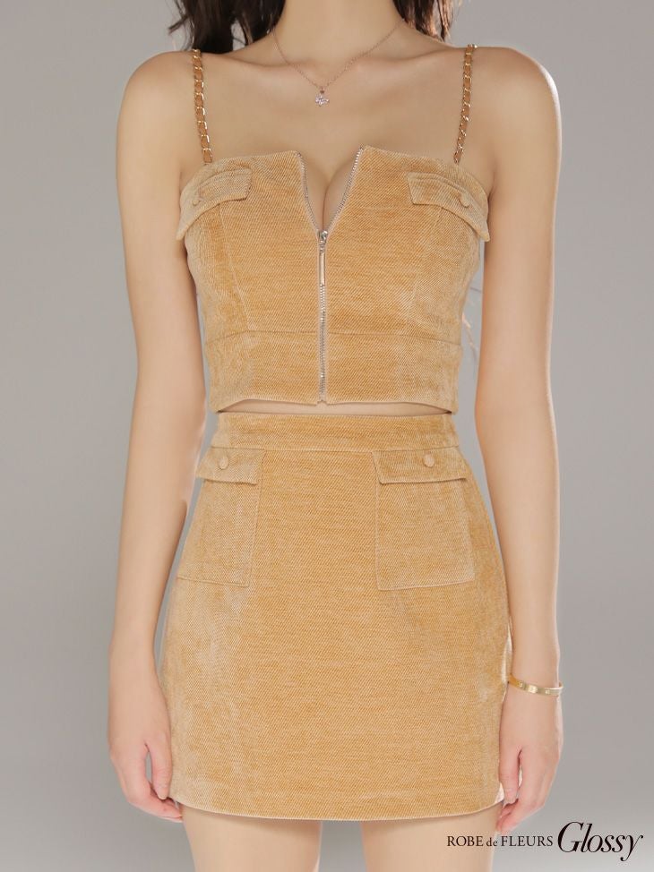 トレンド感溢れるsexyデザイン♡ [ROBEdeFLEURSGlossy/ローブドフルールグロッシー] 高級 ブランド タイトミニドレス セットアップ キャミソール チェーン ジップ コーデュロイ