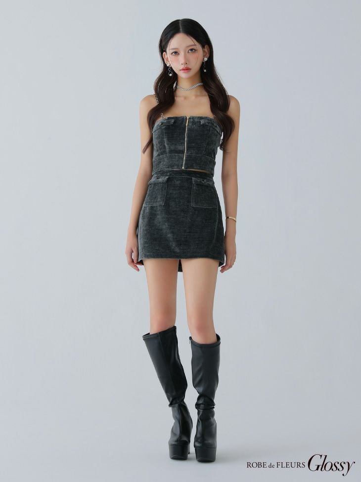 煌めくチェーンがアクセント♡ [ROBEdeFLEURSGlossy/ローブドフルールグロッシー] 高級 ブランド タイトミニドレス セットアップ キャミソール チェーン ジップ コーデュロイ