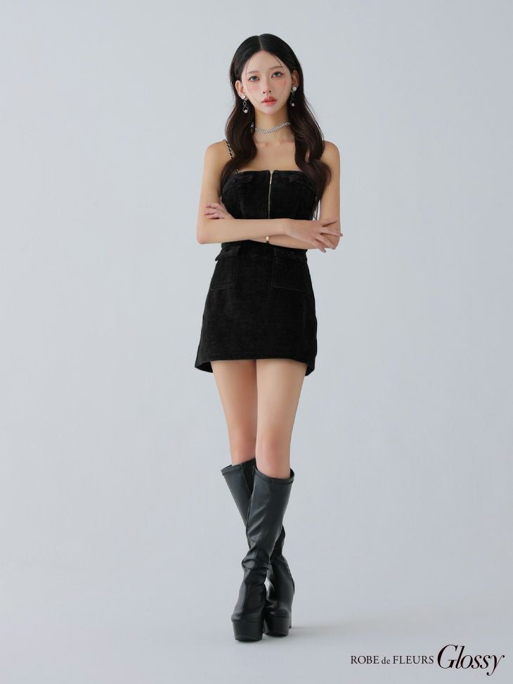 4. [ROBEdeFLEURSGlossy/ローブドフルールグロッシー] 高級 ブランド タイトミニドレス セットアップ キャミソール チェーン ジップ コーデュロイ