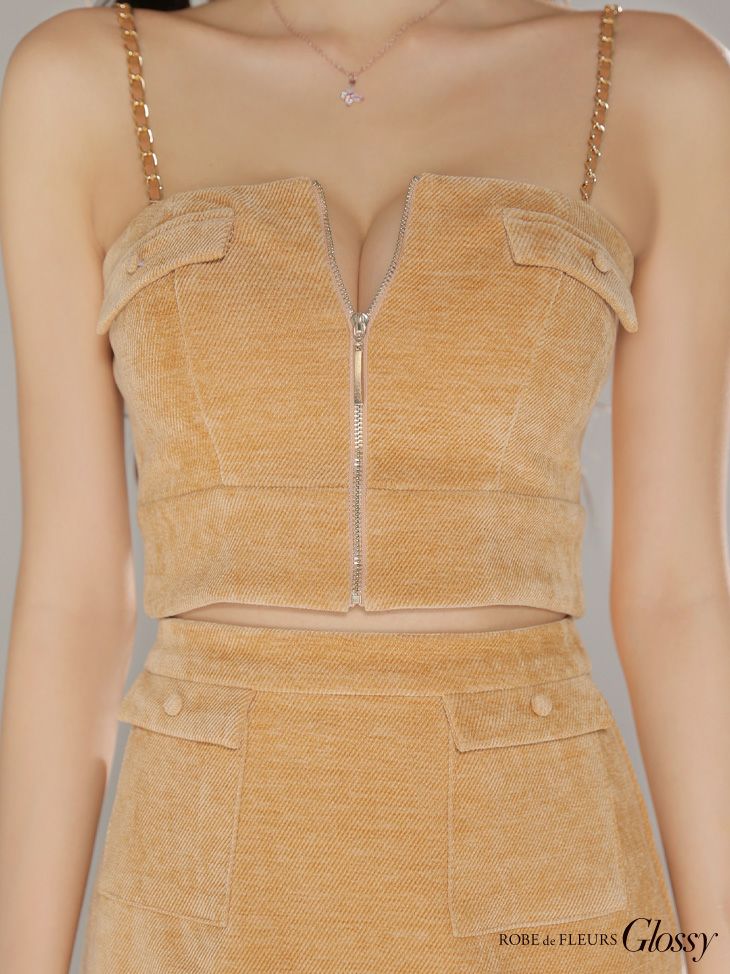 クールかつ女性らしさ漂う♡ [ROBEdeFLEURSGlossy/ローブドフルールグロッシー] 高級 ブランド タイトミニドレス セットアップ キャミソール チェーン ジップ コーデュロイ