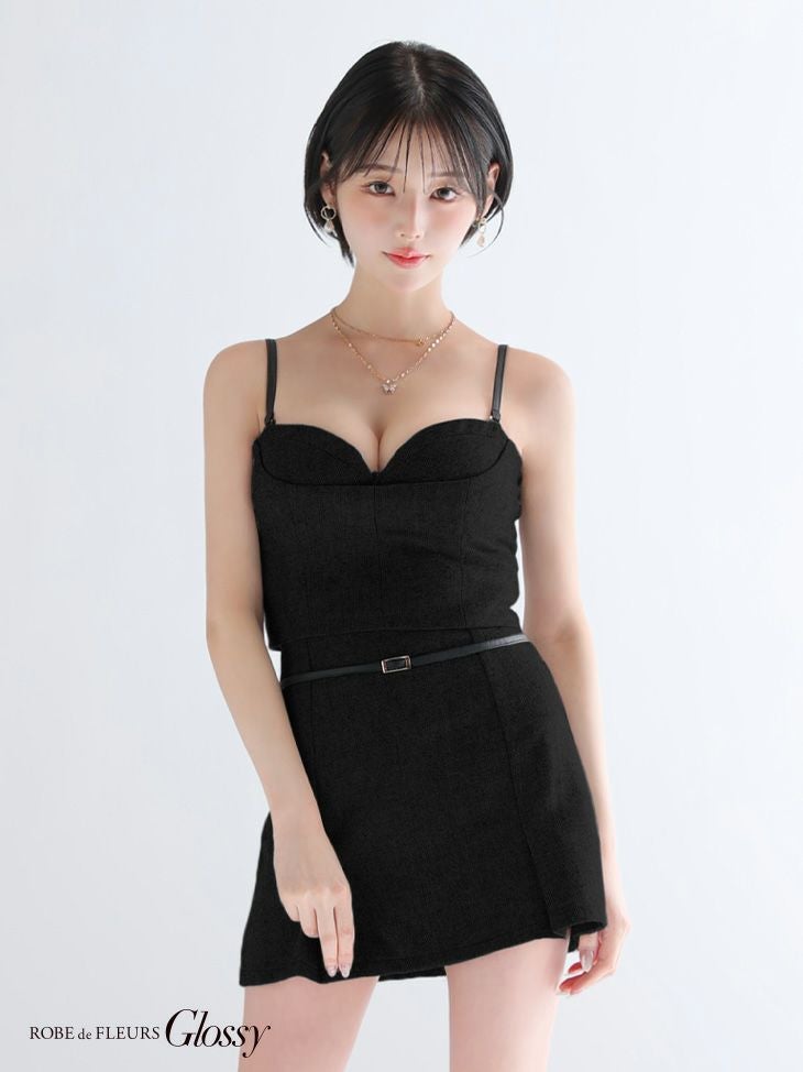大胆な肌見せで魅了する♡ [ROBEdeFLEURSGlossy/ローブドフルールグロッシー] 高級 ブランド タイトミニドレス セットアップ キャミソール 2way 谷間 ウエストベルト レザー プリーツ