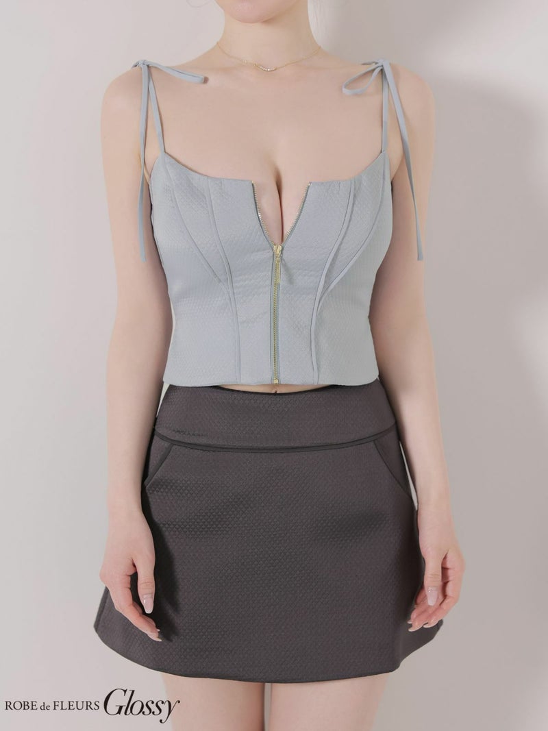 スッキリとしたsexyボディをメイク♡ [ROBEdeFLEURSGlossy/ローブドフルールグロッシー] 高級 ブランド タイトミニドレス 谷間 セットアップ キャミソール ショルダーリボン ジップ 背中魅せ キルティング パイピング
