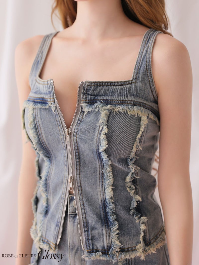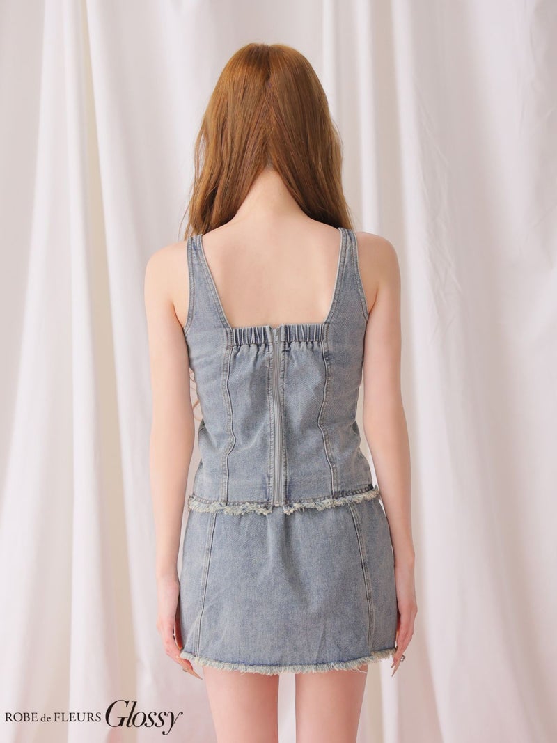 周りと差がつくデニムセットアップ♡ 予約商品【3月下旬入荷予定】[ROBEdeFLEURSGlossy/ローブドフルールグロッシー] 高級 ブランド タイトミニドレス 谷間 セットアップ キャミソール デニム フリンジ ジップ スクエアネック