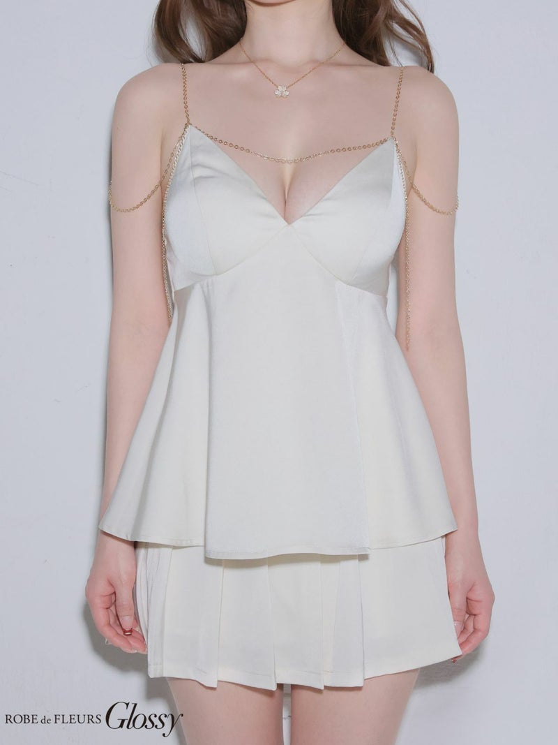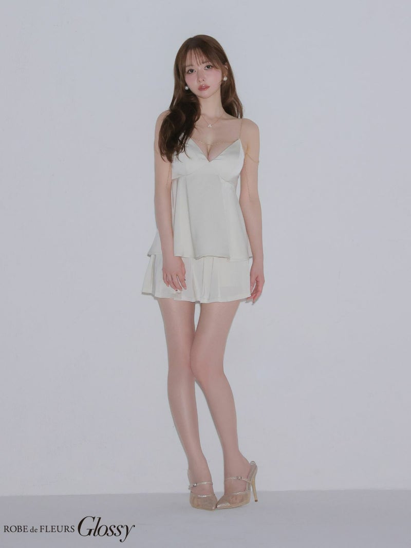ラグジュアリーなムードを演出♡ [ROBEdeFLEURSGlossy/ローブドフルールグロッシー] 高級 ブランド Aラインミニドレス 谷間 チェーンキャミソール セットアップ サテン