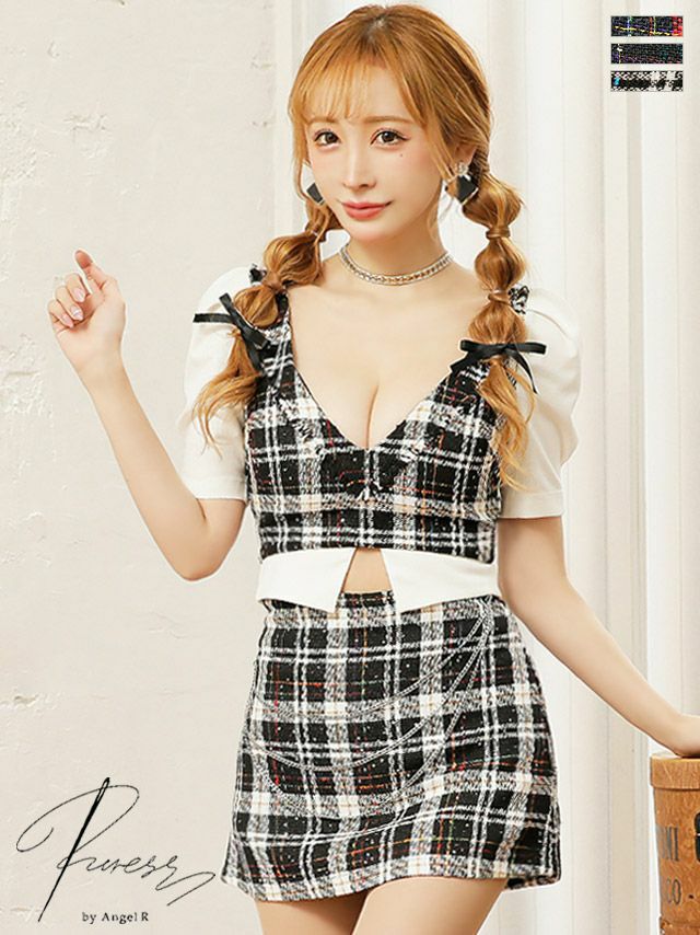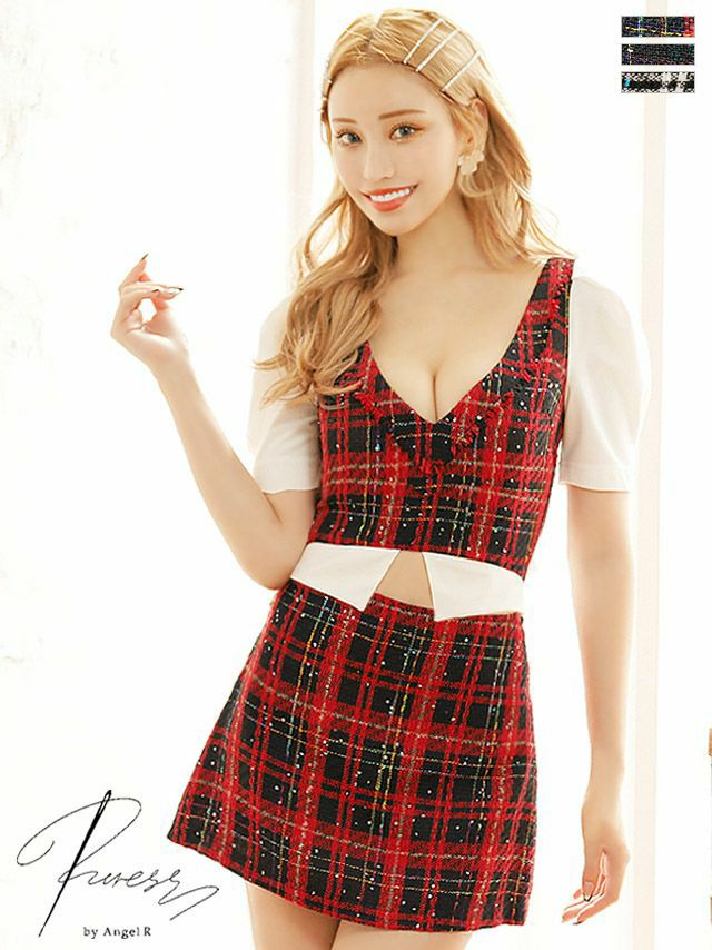 コスプレチックな可愛さ炸裂☆ [PURESS/ピュアレス] 高級シャツレイヤード半袖ツイードチェック柄チェーン付きセットアップフレアミニドレス