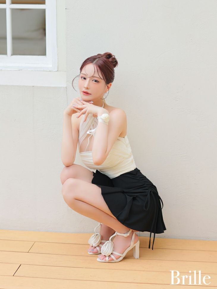 上品な肌見せを叶える♡ [Brille/ブリエ] 高級 ホルターネック チュール 背中魅せ セットアップ プリーツ リボン フレアミニドレス