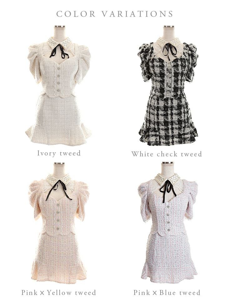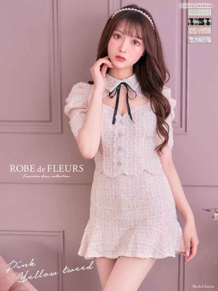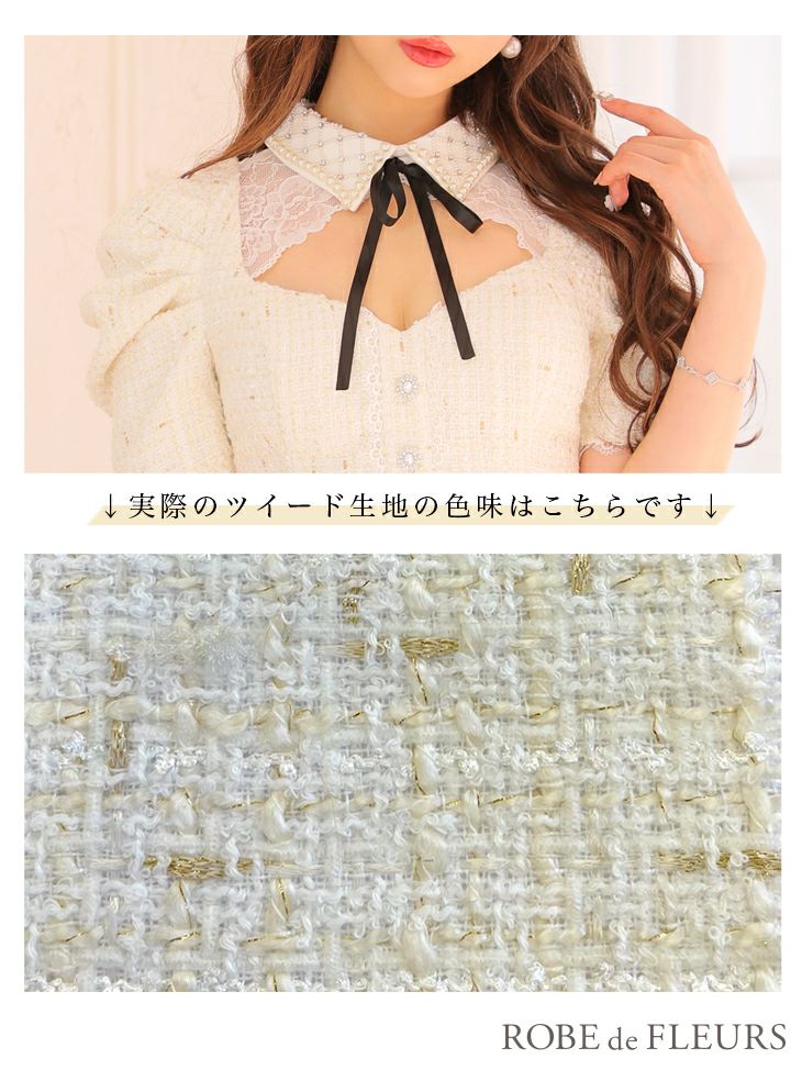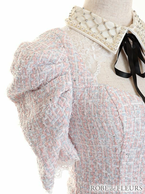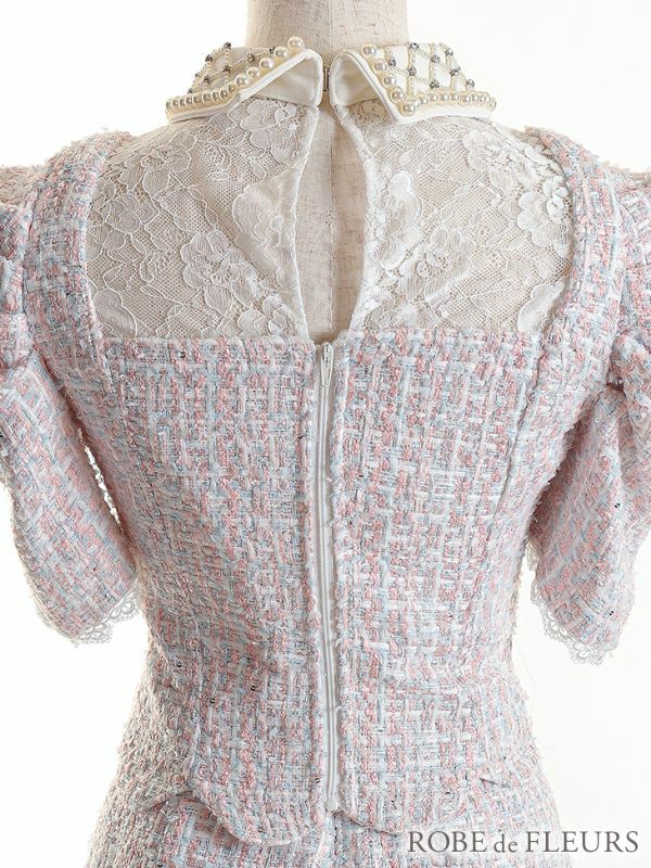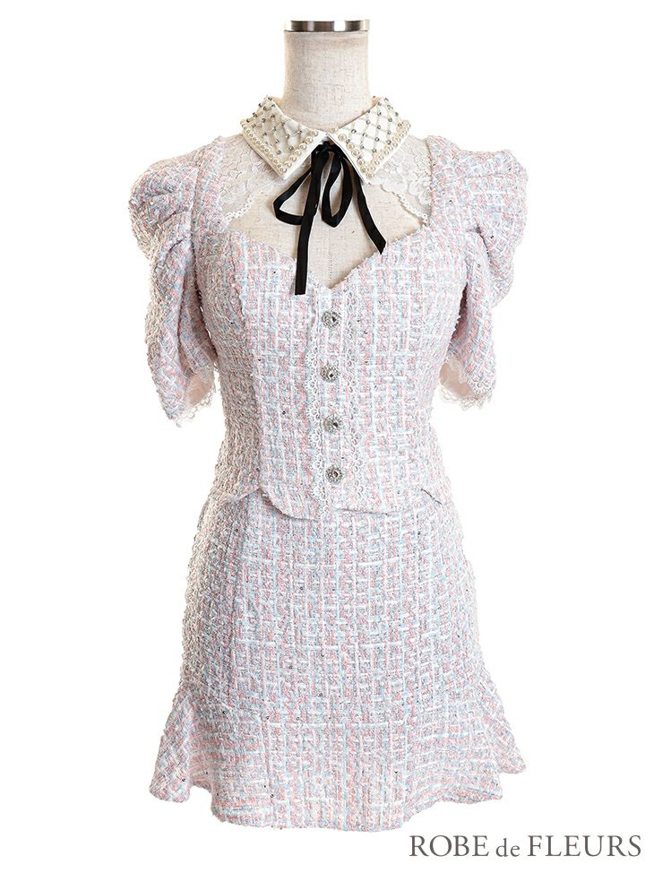 ツイードパールのクラシカルドレス☆ [ROBEdeFLEURS/ローブドフルール] 高級パール襟ツイードスカート袖ありパンツセットアップドレス