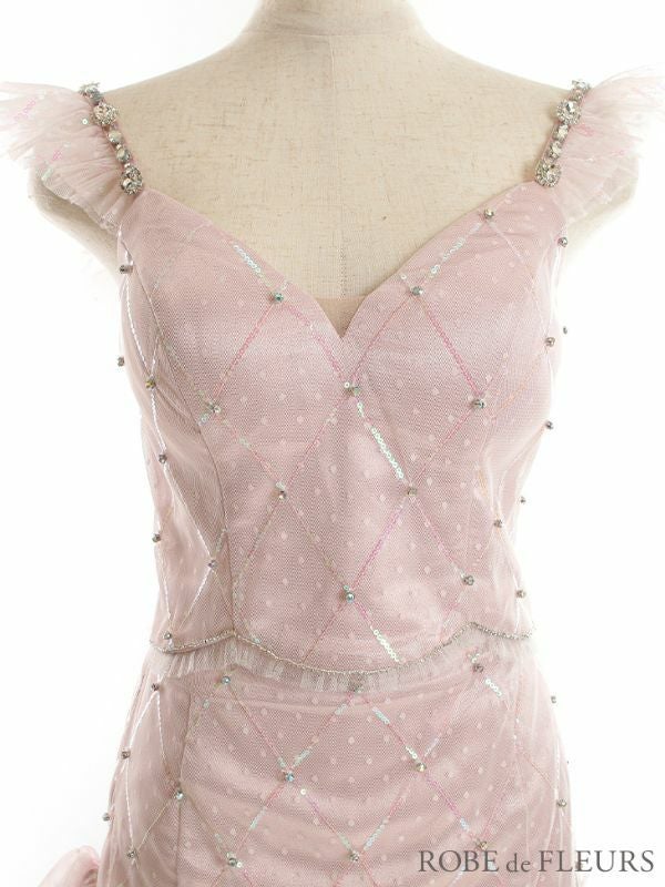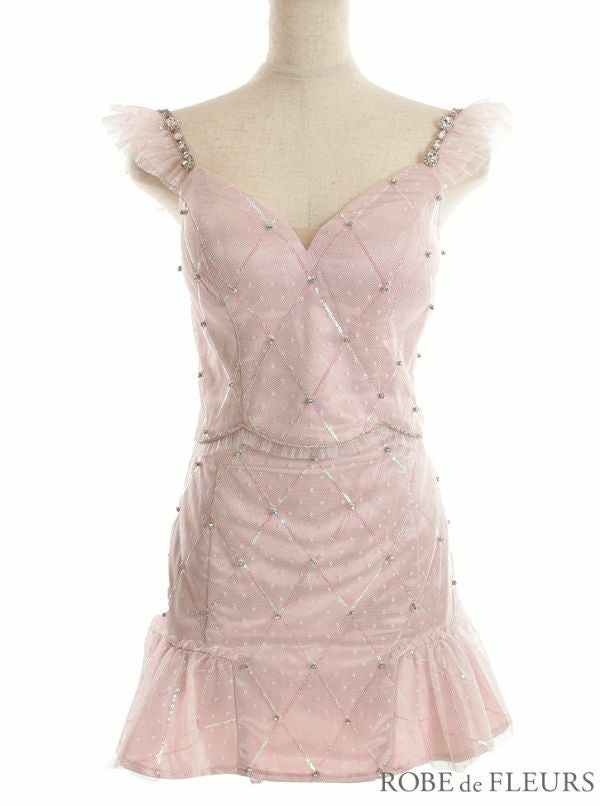 チュールがアクセント☆ SALE [ROBEdeFLEURS/ローブドフルール] 高級レーススパンコールドット柄チュールフリルビジューワンカラーセットアップキャミソールフレアミニドレス