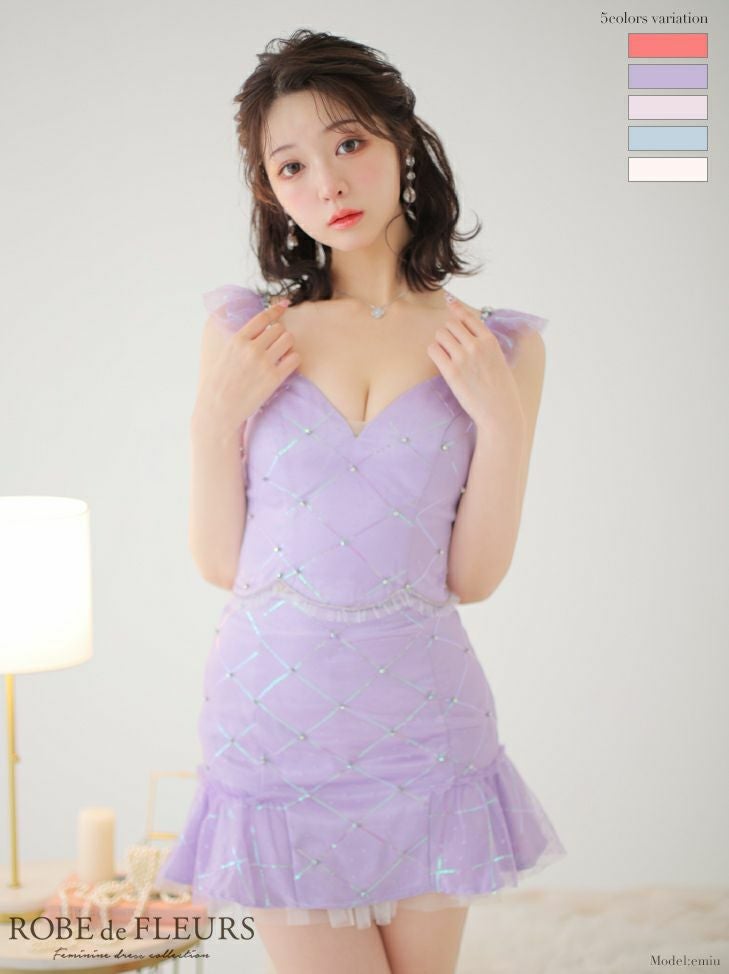 ドットチュールが可愛い☆ SALE [ROBEdeFLEURS/ローブドフルール] 高級レーススパンコールドット柄チュールフリルビジューワンカラーセットアップキャミソールフレアミニドレス