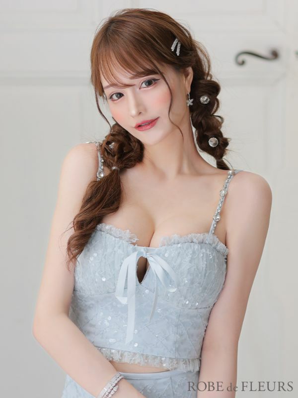 高見え抜群☆ [ROBEdeFLEURS/ローブドフルール] 高級スパンコールビジューリボン裾フリルセットアップキャミソールタイトミニドレス