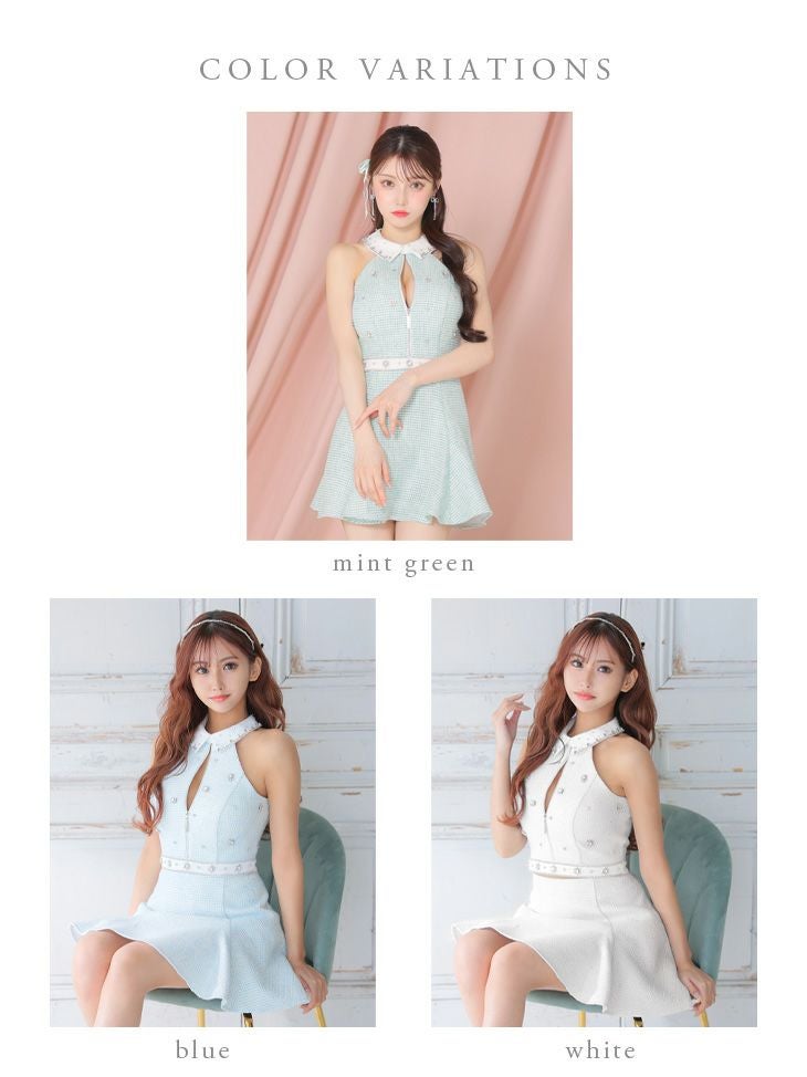 大粒ビジューが華やか☆ [ROBEdeFLEURS/ローブドフルール] 高級 襟付き フロントジップ ホルターネック ツイード セットアップ フレアミニドレス