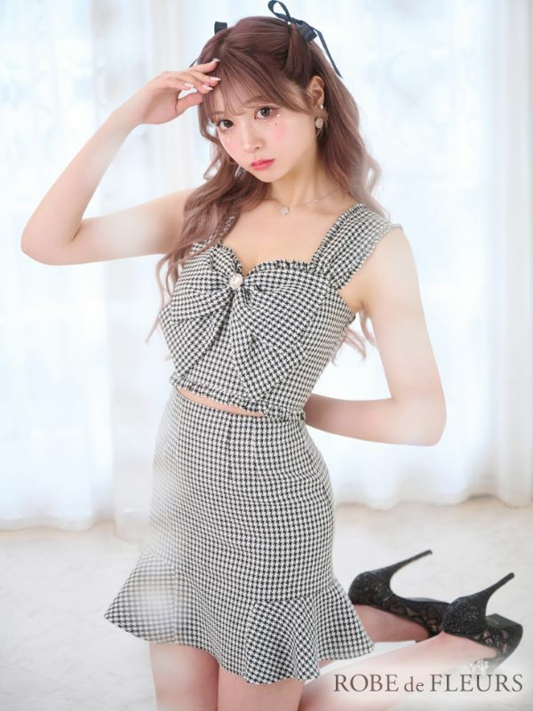 5. [ROBEdeFLEURS/ローブドフルール] 高級セットアップツイードフロントビジューリボン千鳥格子柄フリルノースリーブタイトミニドレス