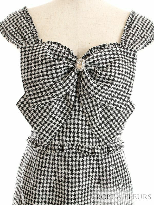 大きなリボンが可愛くアクセントに☆ [ROBEdeFLEURS/ローブドフルール] 高級セットアップツイードフロントビジューリボン千鳥格子柄フリルノースリーブタイトミニドレス