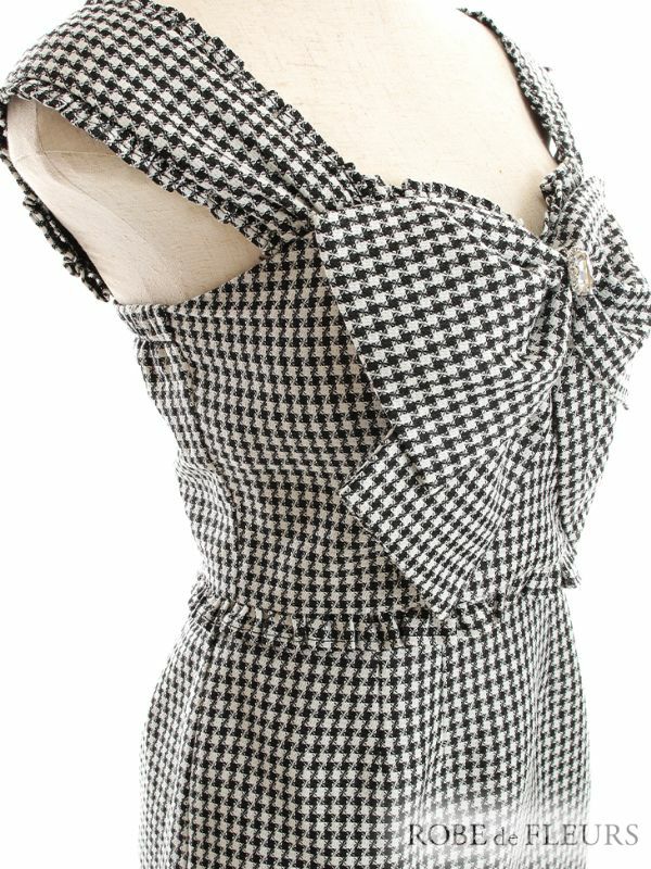 4. [ROBEdeFLEURS/ローブドフルール] 高級セットアップツイードフロントビジューリボン千鳥格子柄フリルノースリーブタイトミニドレス