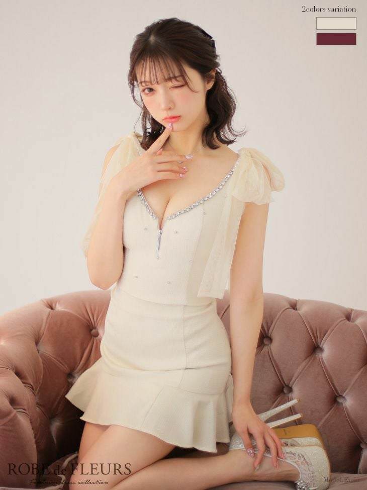 ROBEdeFLEURSらしいセットアップドレス☆ [ROBEdeFLEURS/ローブドフルール] 高級オーガンジーリボンノースリーブ×デコルテビジューセットアップフレアミニドレス
