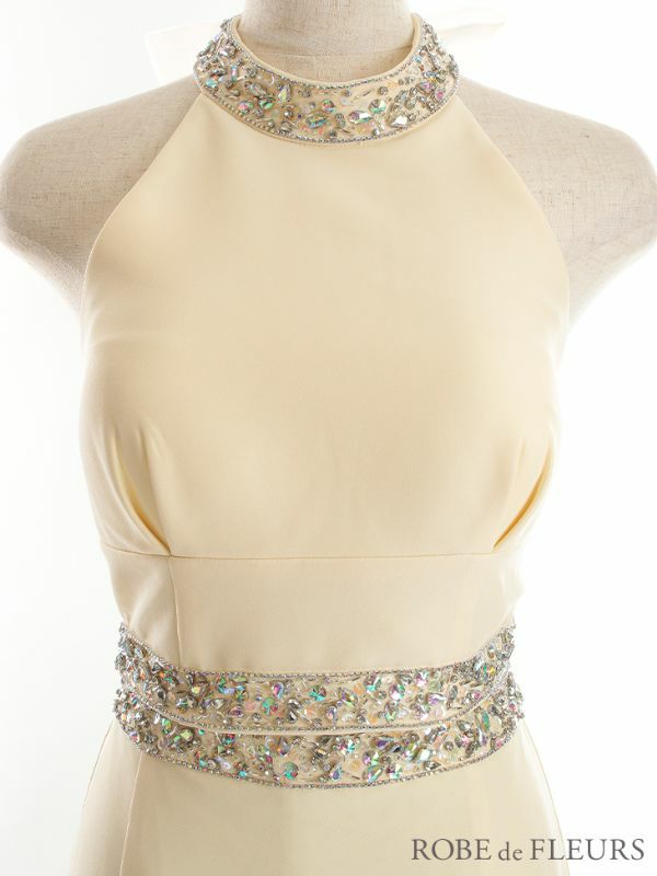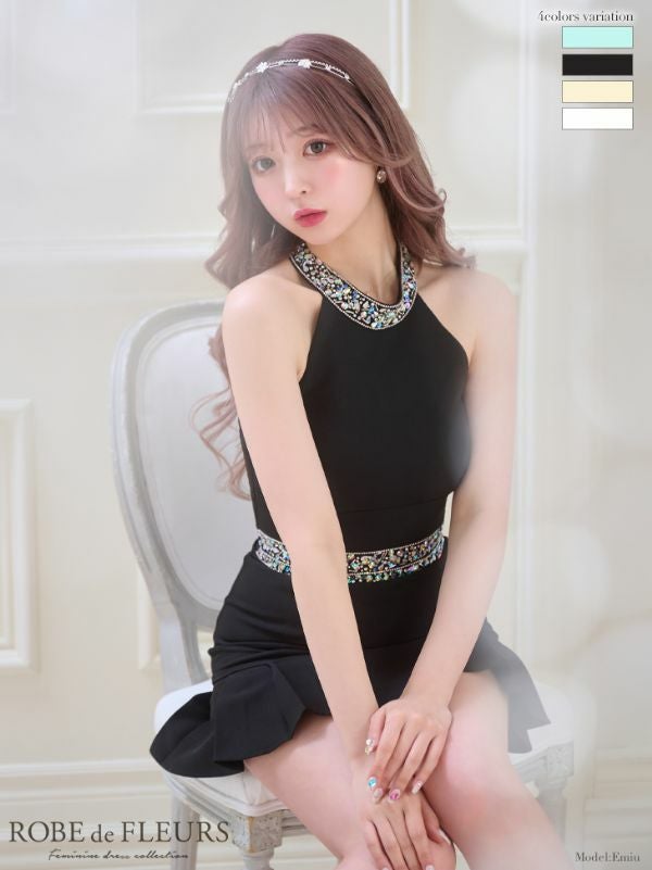 ROBEdeFLEURS ローブドフルール 高級セットアップバックリボンビジューホルターネックワンカラーノースリーブタイトミニドレス