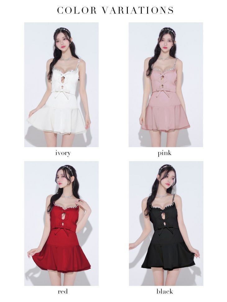 4. [ROBEdeFLEURS/ローブドフルール] 高級 2way キャミソール セットアップ ビジュー センターリボン バストカット 谷間魅せ フレアミニドレス