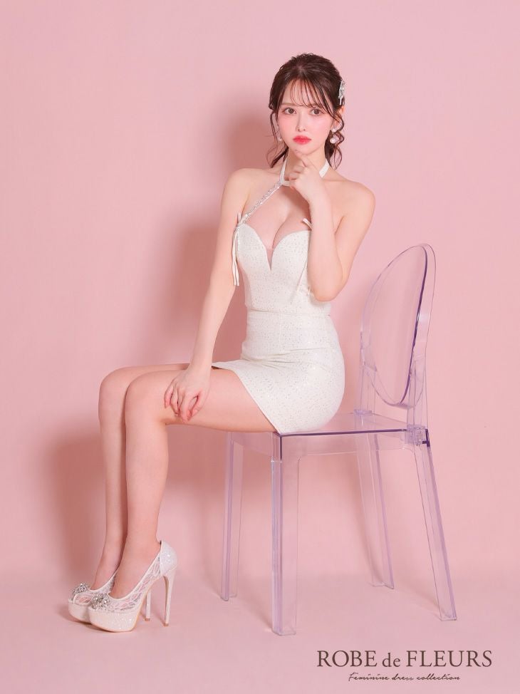 キャバドレス ミニドレス ROBEdeFLEURS ローブドフルール  高級セットアップホルターネックリボンスパンコールツイードタイトミニドレス