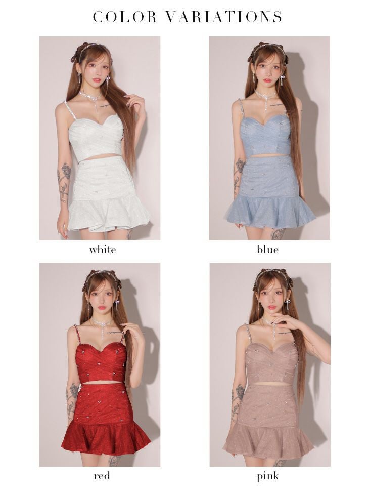 大胆な肌魅せで視線をキャッチ☆ [ROBEdeFLEURS/ローブドフルール] 高級 ブランド Aラインミニドレス キャミソール セットアップ ラメニット チュール ビジュー フリル