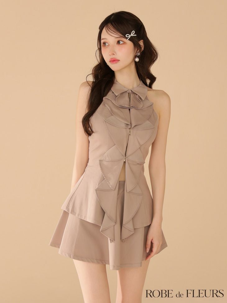 ボリューミーなフリルが可愛い♡ [ROBEdeFLEURS/ローブドフルール] 高級 ブランド Aラインミニドレス セットアップ 背中魅せ ホルターネック 襟付き ジップ フリル