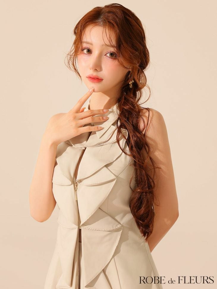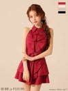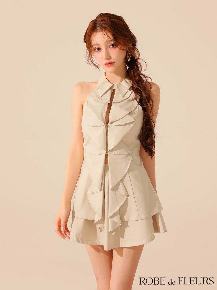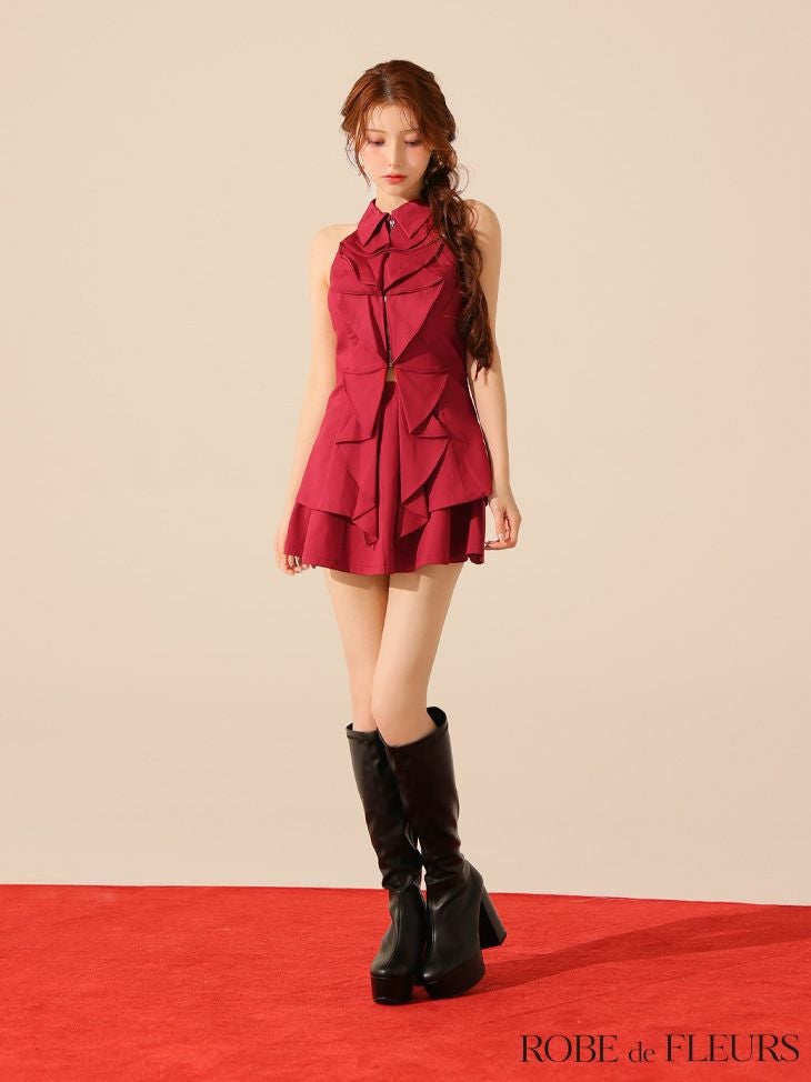 重なったフリルが可愛さを格上げ♡ [ROBEdeFLEURS/ローブドフルール] 高級 ブランド Aラインミニドレス セットアップ 背中魅せ ホルターネック 胸元カバー 襟付き ジップ フリル (もも着用)