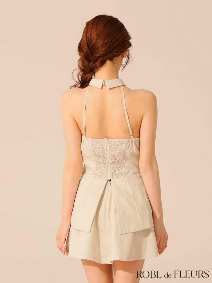 5. [ROBEdeFLEURS/ローブドフルール] 高級 ブランド Aラインミニドレス セットアップ 背中魅せ ホルターネック 胸元カバー 襟付き ジップ フリル (もも着用)