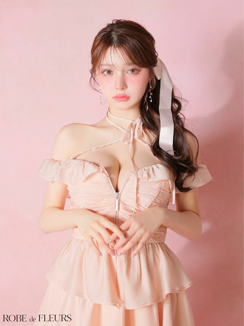 シフォンフリルでドーリーに♡ [ROBEdeFLEURS/ローブドフルール] 高級 ブランド フレアミニドレス セットアップ オフショルダー 谷間 ジップ ペプラム ネックリボン フリル