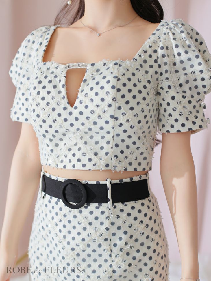 5. SUPER SALE [ROBEdeFLEURS/ローブドフルール] 高級 半袖 セットアップ ウエストベルト ドット柄 パフスリーブ バストカット 谷間魅せ タイトミニドレス