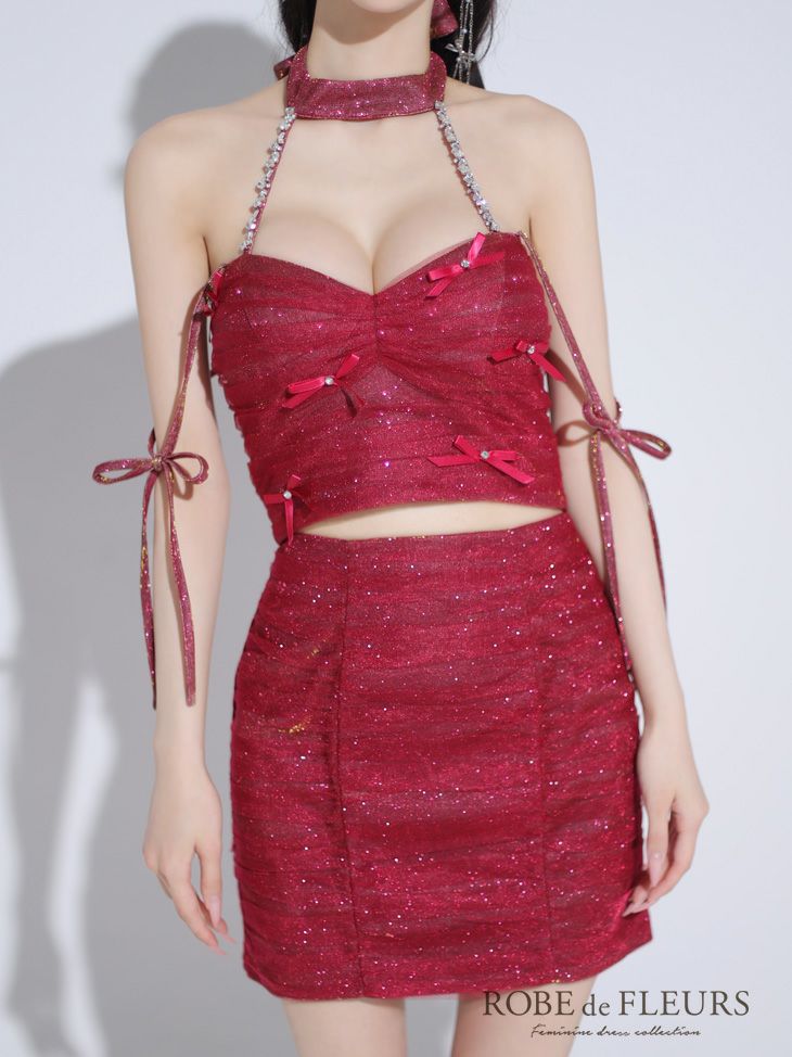 5. [ROBEdeFLEURS/ローブドフルール] 高級ホルターネックセットアップラメチュールサテンリボンタイトミニドレス