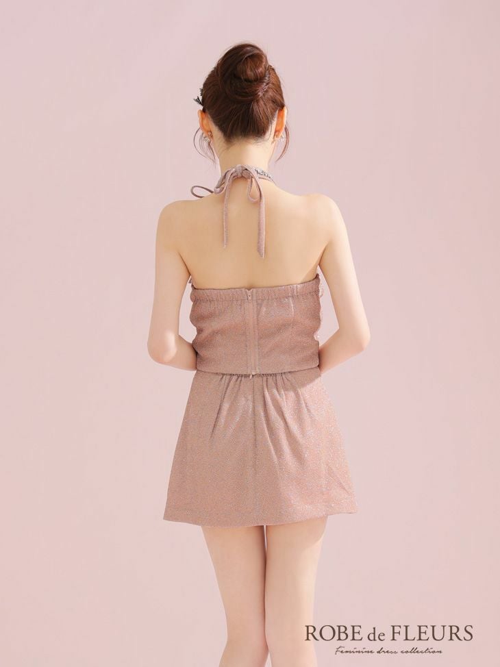 5. [ROBEdeFLEURS/ローブドフルール] 高級 ブランド タイトミニドレス セットアップ ホルターネック ビジュー リボン ラメニット
