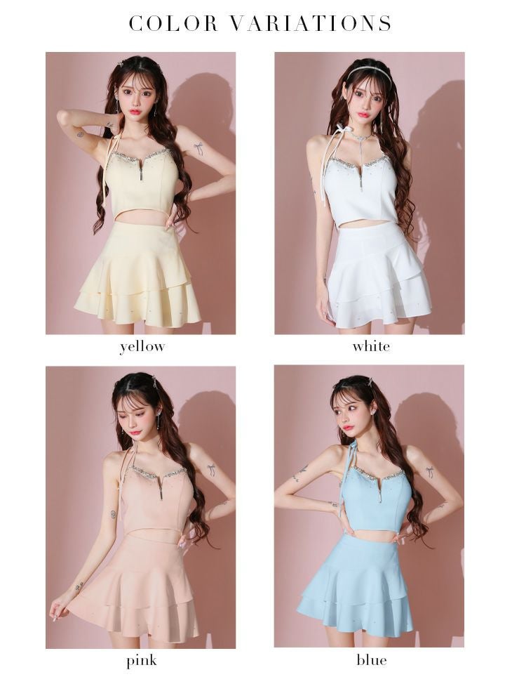5. 予約商品【5月中旬入荷予定】[ROBEdeFLEURS/ローブドフルール] 高級ホルターネックアシンメトリーリボンジップセットアップビジューフリルフレアミニドレス